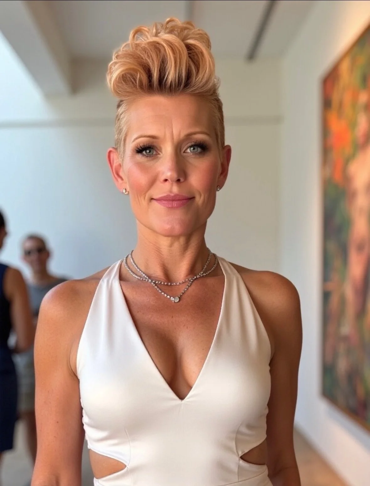 A woman with short blonde hair styled in an updo, wearing a white sleeveless dress with cutouts on the sides, layered necklaces, and earrings, standing indoors with a blurred background showing two people and a colorful artwork on the wall.