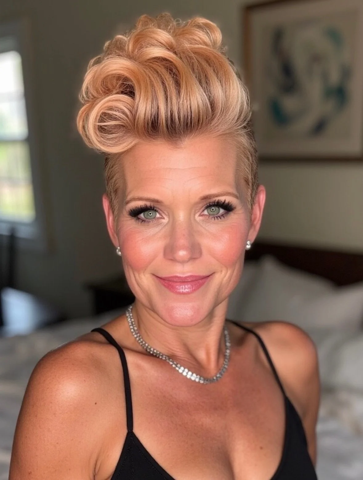 A woman with short, styled blonde hair, wearing a black spaghetti strap top, pearl earrings, and a diamond necklace, smiling indoors with a blurred background.